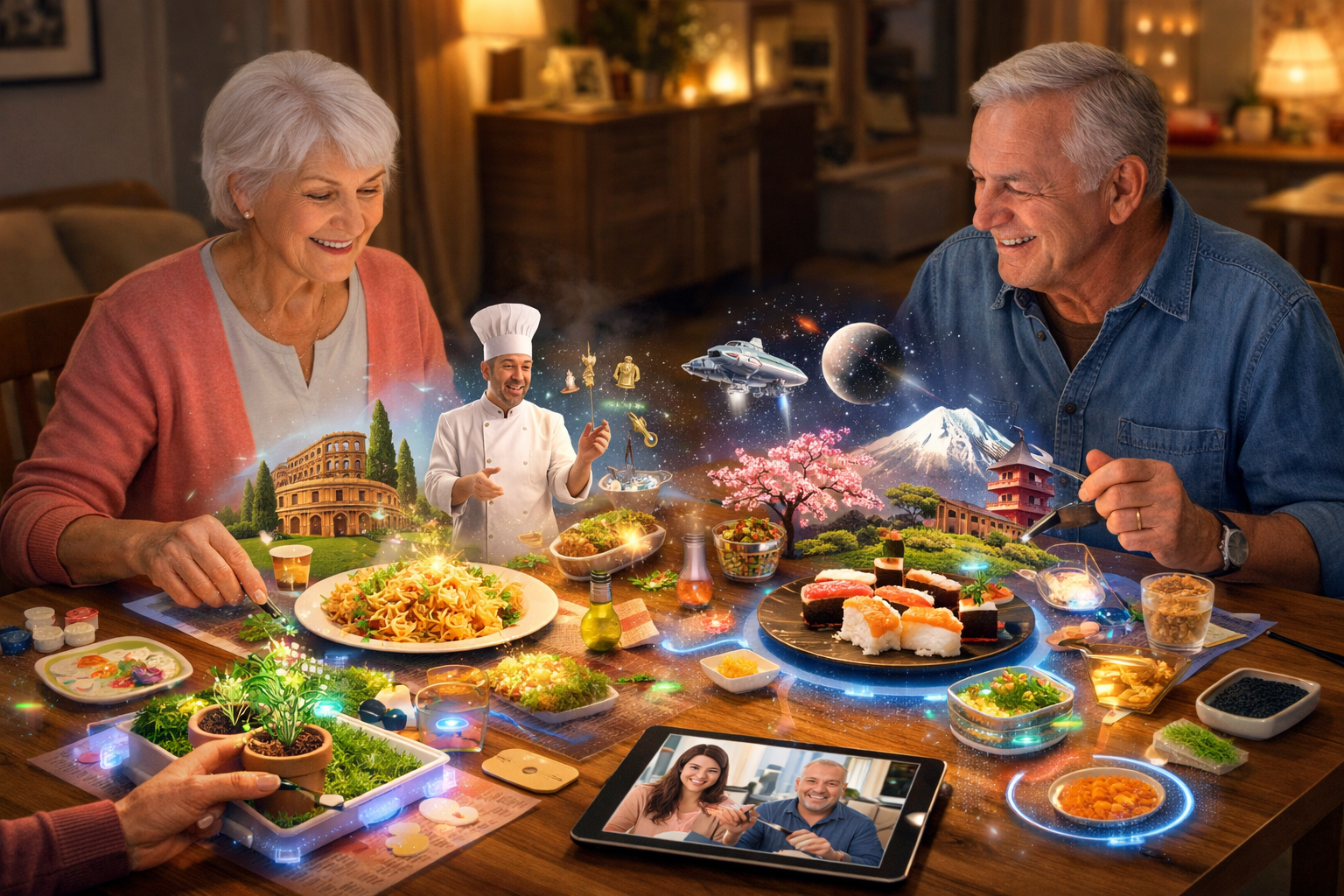 C'est un concept de repas futuriste qui fusionne gastronomie, technologie et créativité pour répondre à ton goût pour les expériences originales et stimulantes. Imaginez un repas livré chez toi, où chaque plat s’accompagne d’une projection holographique qui te transporte dans l’univers de ta recette : un voyage en Italie pour des pâtes, une balade au Japon pour des sushis, ou même une aventure spatiale pour un menu "futuriste".